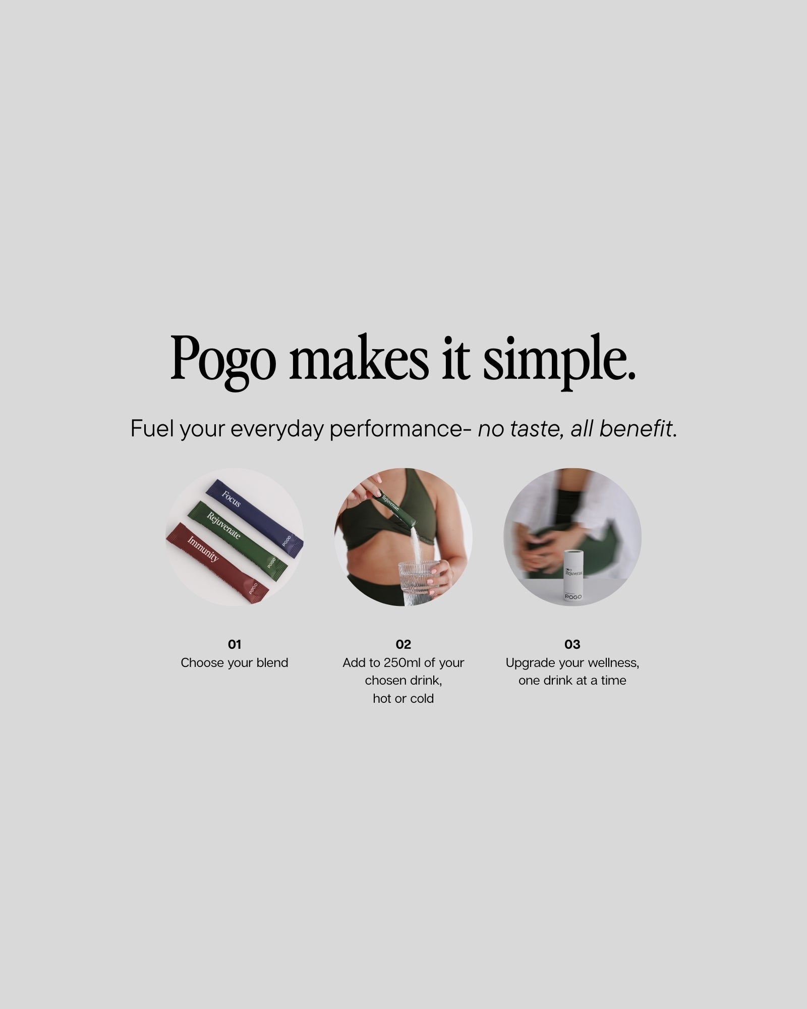 I was really struggling with achieving consistency with my supplements & Pogo has made it so easy. The ease of being able to have the sachets packed in my work bag or handbag has enabled me to easily access them at all times & ensured I’m equipped to put myself & my health first. My work cup of tea or coffee with friends is now supercharged with nutrients and purpose which I absolutely love!!! I have been using rejuvenate for a couple of weeks and have noticed a definite healthier appearance in my skin. I love the anti-aging benefits this has for my skin and the long term benefits it will provide with use.